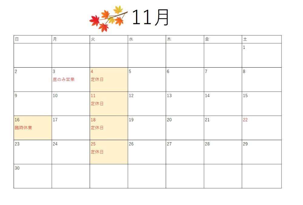 11月23日(日)、11月24日(祝)の営業は都合によりお昼のみとさせて頂きます。